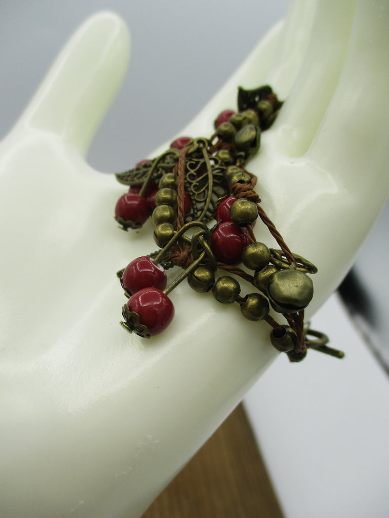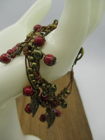 This bracelet is far more delicate and "floating" than it appears in the photo. Constructed on heavy waxed cord, it has two strands with a rotating group of bronze colored beads, leaves and tiny little cherries. The cherries move in whatever direction the wind takes them, creating a casual and intoxicating air.