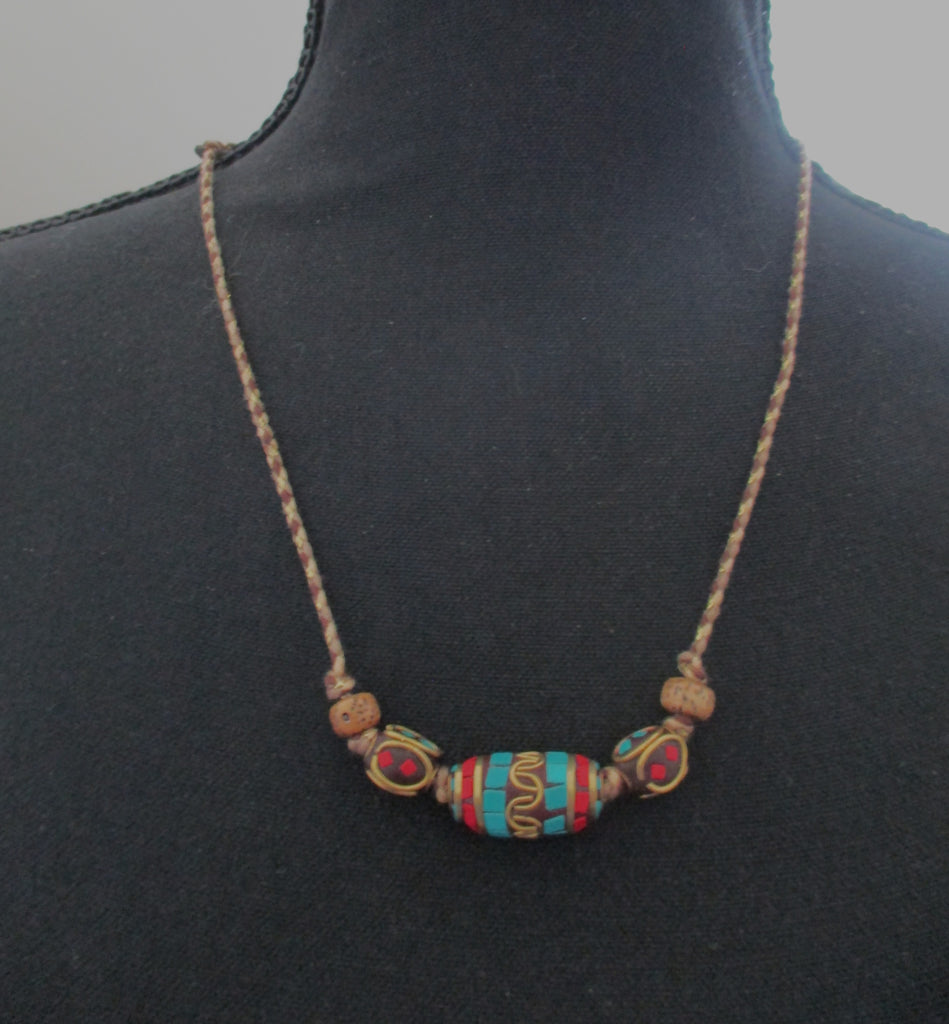 Hung from an adjustable cord, this necklace highights the Tibetan style beads in the center. These are not just simple, painted beads, rather, each red and blue piece is inlay, each bit of metal is as well. They deserve to be highlighted, and this simple necklace does it well.