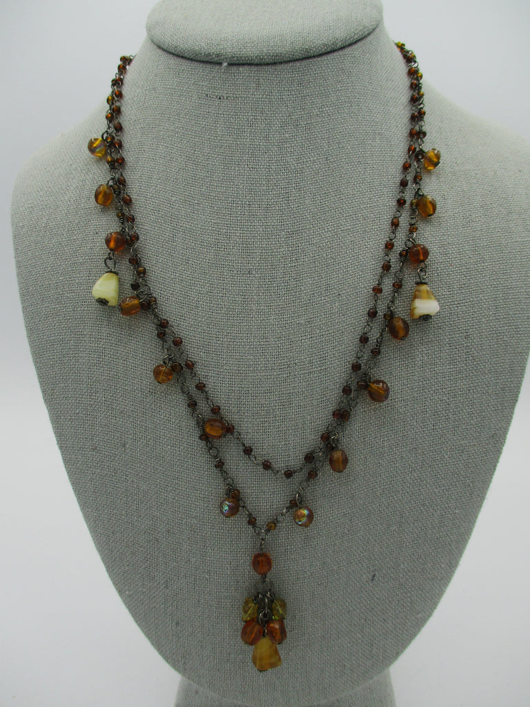 Delicacy is the catch word for this lovely flowing necklace constructed of two strands of beads connected to an individually linked tiny chain.  The beads vary in size from 1 mm throughout the necklace, up to 3 or more mms throughout--each delicate and most translucent.  At the bottom is a "bouquet" of similar beads to catch one's eyes.  This necklace could easily be used as a multi-strand bracelet.