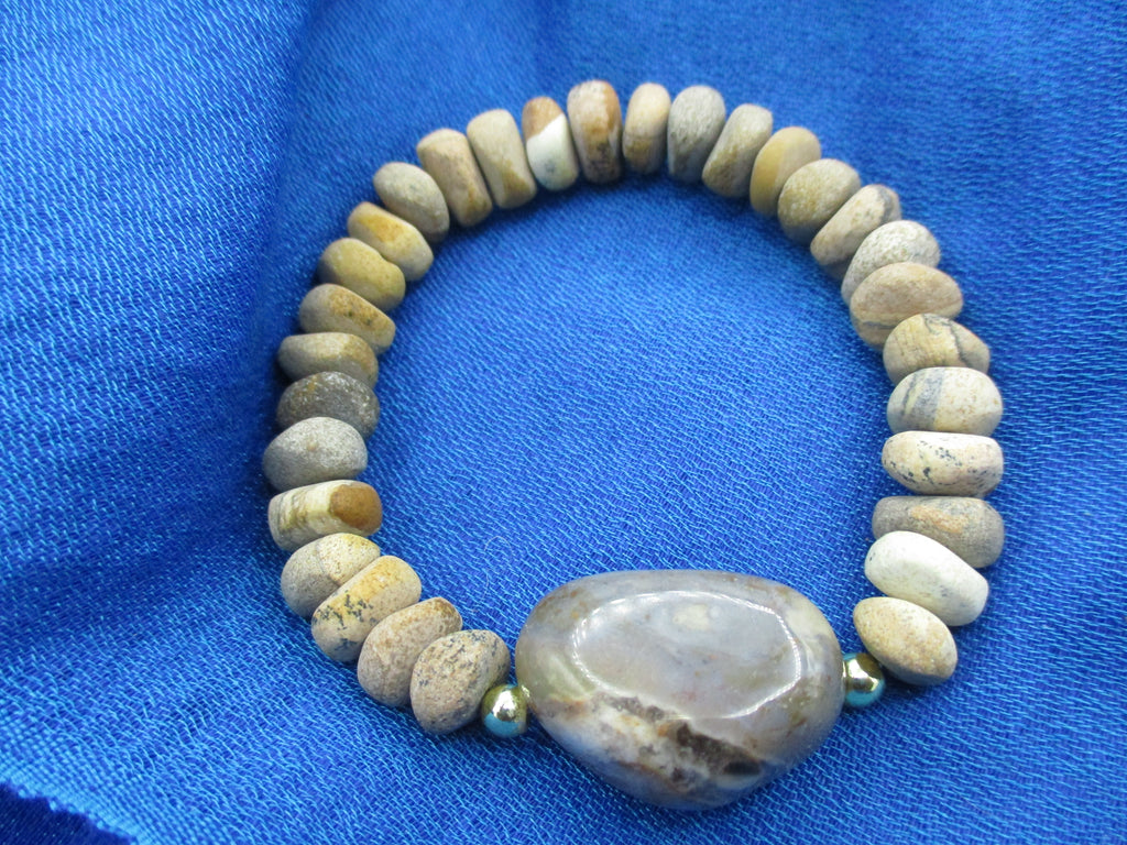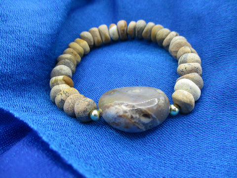 A stretch bracelet with calming matte rondelles of desert picture jasper surrounding a unique polished jasper freeform. Unassuming, yet a perfect match for most any outfit.